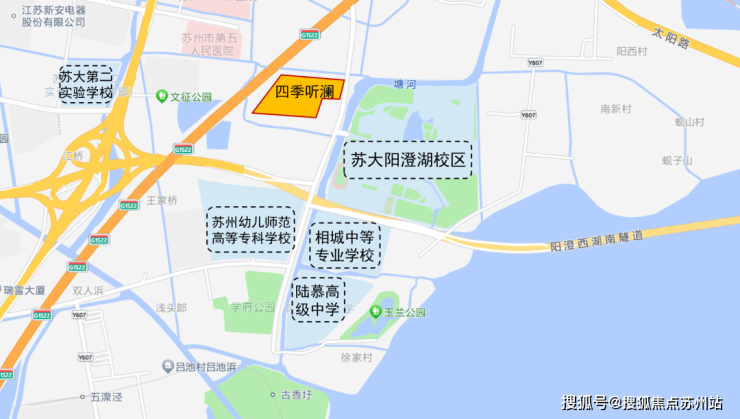 四季听澜的地理位置相当优越,它位于苏州园区金鸡湖向北的第一站——阳澄西湖教育组团板块。这里可以说是都市生活的黄金地段,周边环绕着园区、高铁新城、青剑湖和相城主城这四大都市核心CBD。交通方面,项目周边形成了两横两纵的路网格局,包括中环北线、太阳路高架、苏州北站高架路以及济学路。未来随着阳澄湖星济隧道的通车,从四季听澜到园区湖西将变得非常便捷。值得一提的是,项目紧邻地铁8号线古香圩站,可以轻松换乘地铁1号线号线,出行十分便利。