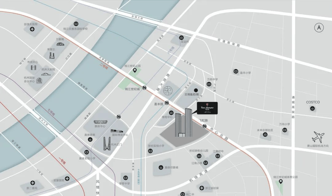 钱江世纪城奔竞大道的战略地位,堪比纽约第五大道与巴黎香榭丽舍的叠加态。项目与SKP直线米的黄金距离,构建起步行5分钟即达亚洲店王的消费霸权,而亚运莲花碗与杭州之门形成的270°江景视野,则复刻了香港维多利亚港的景观溢价模型。地铁2号线分钟直达萧山机场的效率,足以对标伦敦金丝雀码头的商务能级。