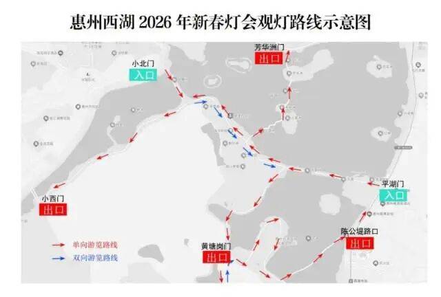 3、灯会期间,西湖景区核心区域实行入园预约机制,出入口实行安保管控制度。游客入口为平湖门、小北门(只进不出),出口为小西门、芳华洲、黄塘、陈公堤(只出不进)。详见下图。