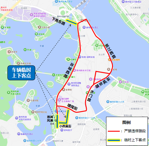 请前往西湖景区游园观灯的游客尽量选择公交出行,到就近的公交接驳点换乘公交往返。请途经车辆提前规划好行车线路,尽量避开上述交通管制路段,采取错峰或绕行方式出行,避免交通拥堵。惠州市公安交管部门将根据交通安保工作实际,视情调整交通管制时间和管制措施。请广大市民给予支持配合,服从现场交警和工作人员的指挥。